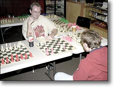 Over 25 games were played including Steele’s multi-player game. Chess enthusiasts from all over came to test their skills, including a family from Enterprise and Dothan, AL. A total of $167 was raised for the Ardmore Boys and Girls Club after a $40 donation from the Coffee Pod. Door prizes were donated for the benefit and the winners were randomly drawn. Tom Rezall won a Four Game Chess Set, Steve Spray won Collectible Chess Pieces, Alexander Beck won a Class Chess Game, Michelle Higgs won a Scooby Doo Activity Book, Edmond Labate won a 99 piece Art Pack and Victoria Beck won a Giant Lawn and Checkers Set. Even without the weather’s full cooperation, the benefit was successful, and plans are already in the making for next year’s event. |
